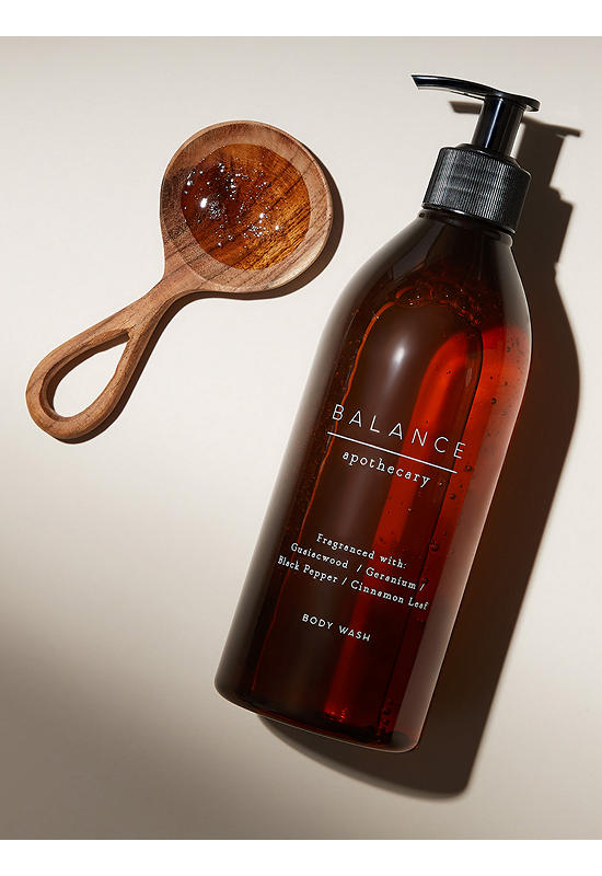 Body Wash Balance from MARKS & SPENCER. Part of our Apothecary range, this Balance body wash uses a carefully selected range of essential oils to refresh and calm. Grounding guaiac wood is accented by delicate floral notes of geranium and the spicy fragrance of black pepper and cinnamon leaf. Massage into wet skin and rinse well.