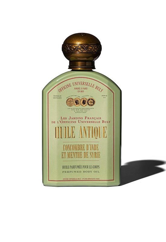 OFFICINE UNIVERSELLE BULY This beautifying treatment, dry to the touch, it is extremely nourishing thanks to a synergy between oils: sesame, apricot, coconut and castor oil. As soon as it is applied, skin regains its suppleness and sacred splendour leaving a trail of  fruity and iodine notes, governed by the greenness of cucumber and mint.