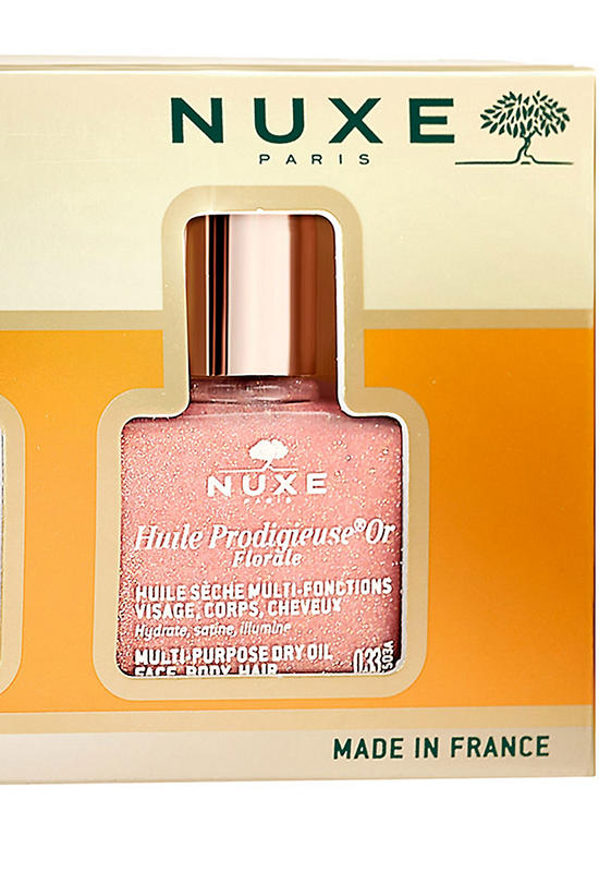• HUILE PRODIGIEUSE OR FLORALE MULTI-PURPOSE DRY OIL : A luxurious skincare product for the face, body, and hair, suitable for all skin types and tones. Infused with rose gold mica particles derived from mica minerals, it blends 4 pearl shades for the perfect luminosity and skin-enhancing effects. The refreshing floral fragrance combines notes of grapefruit, magnolia, and musk. This fast-absorbing, non-greasy dry oil provides hydration, a satin-soft finish, and a radiant rose gold glow. With a 96% natural-origin formula, it features 7 botanical oils—Tsubaki, Camellia, Argan, Sweet Almond, Borage, Hazelnut, and Macadamia—to deeply moisturize, soften, soothe, protect against pollution, and combat signs of aging.