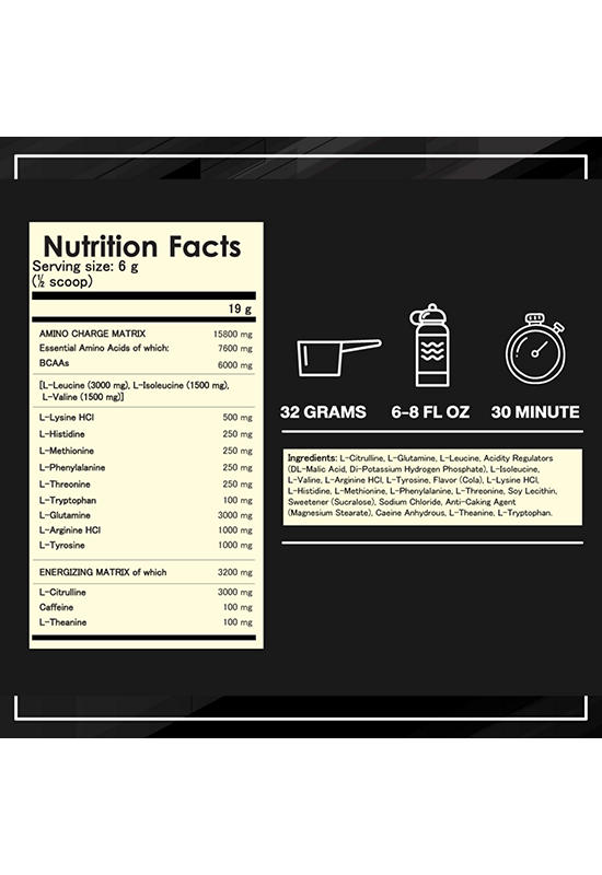 Amino Charge is a complex essential amino acid formula, which you can consume before or during training (or for all day energy for any kind of mental or physical task just factor in the Caffeine content!) It promotes efficient training and provides energy with its 15 active ingredients!