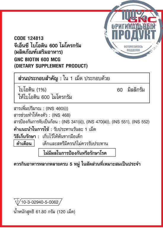 Подробное описание товара на сайте поставщика https://www.central.co.th/en/gnc-biotin-600mcg-120-tablets-mkp1817408