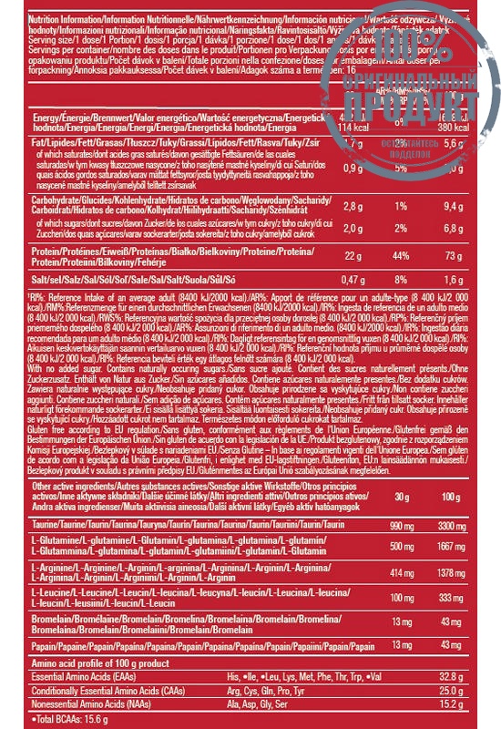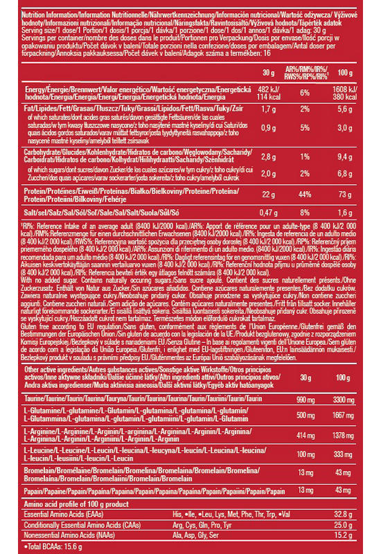 100% Whey Protein Professional has more added components: an “Amino Acid Matrix” that provides popular extra amino acids, namely L-Leucine, L-Glutamine and Taurine. Also, the digestive enzyme blend of Papain and Bromelain is included in our formula!