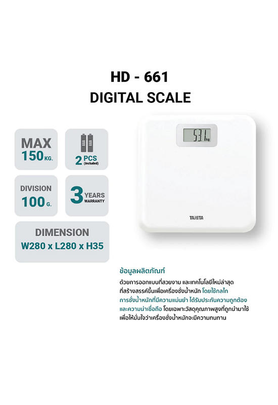 HD-661 Tanita With a beautiful design and the latest technology created for scales Using a precision weighing mechanism Guaranteed accuracy and reliability Especially high quality materials are used to ensure that the scale is durable.