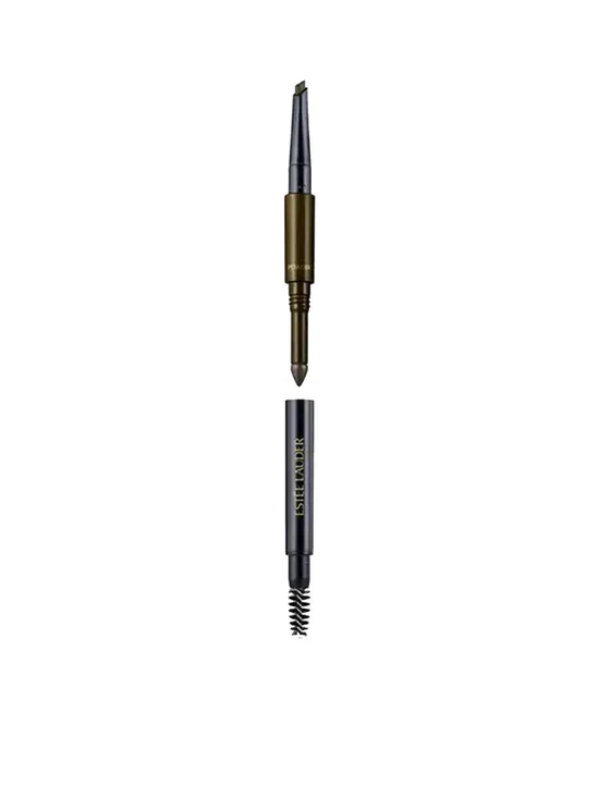 Brown pencil from ESTĒE LAUDER—Sculpt, shape and define your arches with this innovative 3-in-1 brow tool. On one end, a unique triangular tip pencil fills and contours brows with a custom thin or thick stroke. In the center, a sponge-tip applicator primed with brow powder creates fullness and depth. Style and set your brow look with the spooled brush.