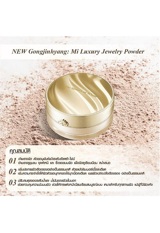 THE WHOO The Gongjinhyang: Mi Luxury Luminous Powder enhances oil-absorbing capabilities and provides a high fixing effect, which helps to reduce excess powder after application and keep your makeup looking fresh and flawless throughout the day. Additionally, the size of the powder and pearl particles have been carefully adjusted to effectively fill in fine lines and pores. The wide range of particle sizes reflects light in various ways, resulting in a natural soft-focus effect that minimizes the appearance of imperfections and creates a subtle, elegant glow.
