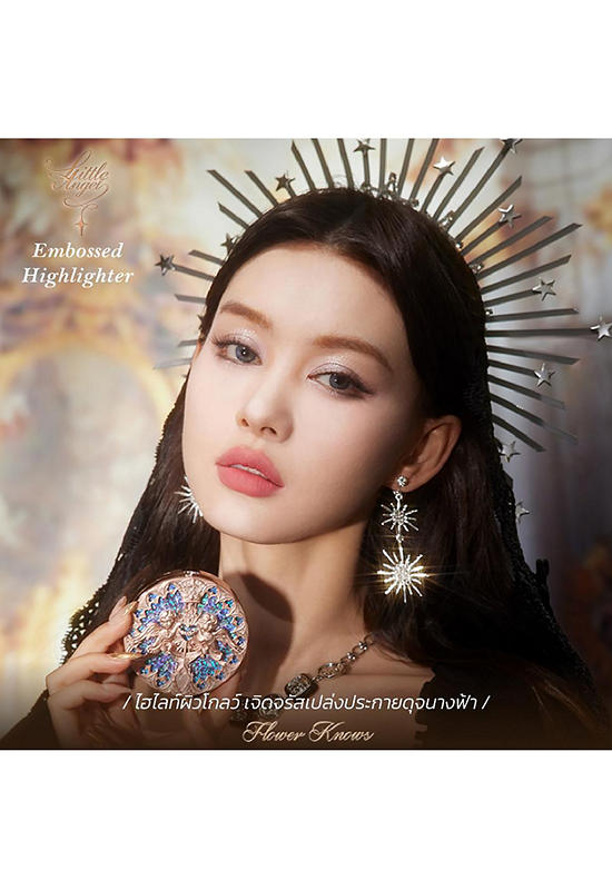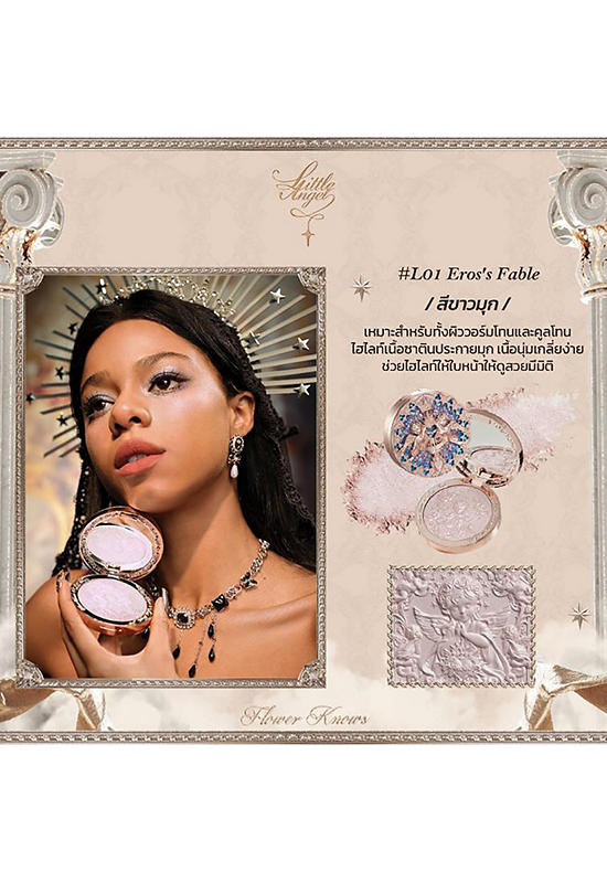 FLOWER KNOWS A glowing highlighter inspired by the fantasy art of medieval Western worlds, featuring an embossed design that captures ethereal beauty. This soft, finely milled formula blends effortlessly and offers long-lasting wear, enhancing your complexion with a radiant, angelic glow. It diffuses light naturally to add dimension and luminosity to your face, completing your makeup look perfectly all day long.