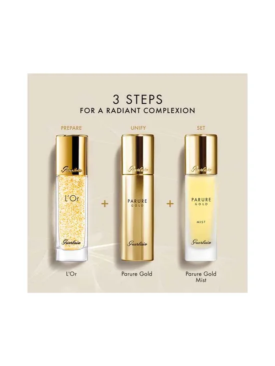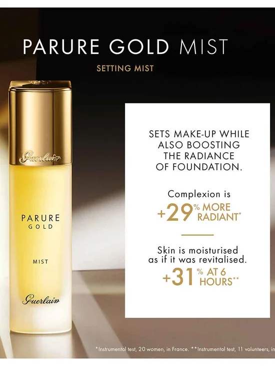 Parure Gold Mist from GUERLAIN is the final step for a flawless make-up result. It sets make-up and brings a more radiant finish to foundation. The complexion gets an immediate beauty boost thanks to the formula’s moisturising and smoothing properties, which are designed to leave the skin suppler, moisturised as plumped. Formulated to act as a beauty-enhancing and protective (pollution) veil, it creates a thin barrier over the skin and protects it from free radicals. The complexion remains flawless, with a sensation of soft comfort that lasts all day long.