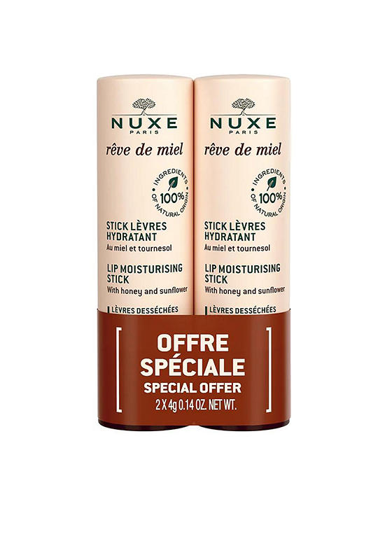 Reve De Miel Lip Moist Duo Set by NUXE. A perfect duo for lip care, designed to restore moisture and softness to your lips. Infused with the power of honey and natural ingredients, this set helps protect and nourish dry, chapped lips, leaving them smooth and hydrated all day long.