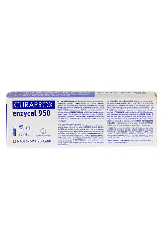 Enzycal 950 Extra mild Normal sodium fluoride content: 950 ppm. Double protection against decay thanks to sodium fluoride and enzymes - to boost the natural, protective power of your saliva. RDA 30: very gentle. Suitable for the whole family - for 6 years and upwards. Made in Switzerland. Mild is now strong: cleans without injuring and strengthens with enzymes. Everything that might possibly be harmful has been eliminated. Instead, it supports the protective function of the saliva. Enzycal contains no aggressive substances. The aggressive foaming agent, sodium lauryl sulphate (SLS) found in most toothpastes has been replaced by a neutral one. Essential oils such as menthol have been reduced to a minimum. Even the RDA is low. In contrast, Enzycal has three enzymes that are already present in saliva - this miracle fluid in oral hygiene can even repair dental enamel. The saliva with its protective and repair functions is further boosted by the enzymes in Enzycal - which also prevents mouth dryness. Enzycal thus ensures healthy teeth, gums and mouth. It also tastes just as mild as it actually is - so mild that it even helps combat mouth ulcers. • No foaming agent SLS: gentle on the mouth. • Contains enzymes: boosts natural saliva protection, promotes re-calcification and protects against dry mouth • Enamel-friendly: practically free of abrasion (RDA 30) • Caries protection from readily available sodium fluoride • Pleasantly mild taste • Noticeably less plaque and tartar • 950 ppm Sodium Fluoride • Suitable also in combination with a sonic toothbrush