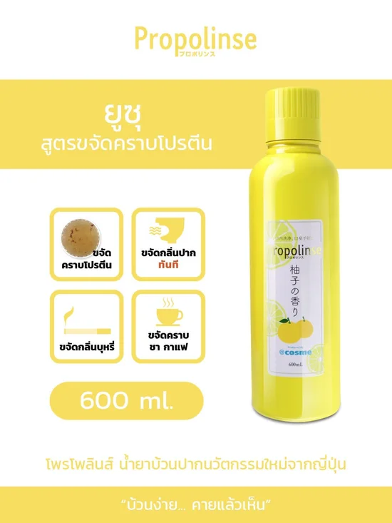 PROPOLINSE Innovative Japanese Mouthwash (Yuzu Flavor) Contains propolis and greentea extract Removes protein particle and bacteria causing your bad breath Gives you a soothing and refreshing feeling