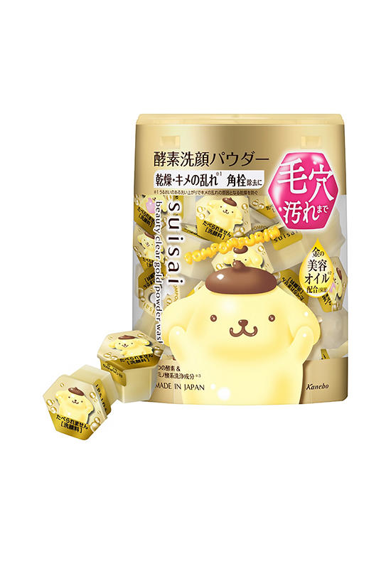 SUISAI Enzyme infused golden powder type facial wash formulated with Golden Oils (Pompompurin, SANRIO Collection). Golden Sunflower Oil (Sunflower Seed Oil). Golden Avocado Oil (Avocado Oil). Highlights. Contains proteolytic enzyme (protease). lipolytic enzyme (lipase). and amino acid-based cleansing ingredients (sodium lauroyl glutamate.sodium myristoyl glutamate). Contains aquaglucoside (ethyl glucoside) and sodium hyaluronate. Contains golden sunflower oil (sunflower seed oil). golden avocado oil (avocado oil). Removes blackheads. keratotic plugs and dead skin cells while leaving skin feeling moisturized. Creates smooth. moisturized. and soft skin without feeling tight. Protects dryness that causes unevenness in complexion. After use. Lotion blends easily into your skin. Recommended for people who are concerned about dryness.