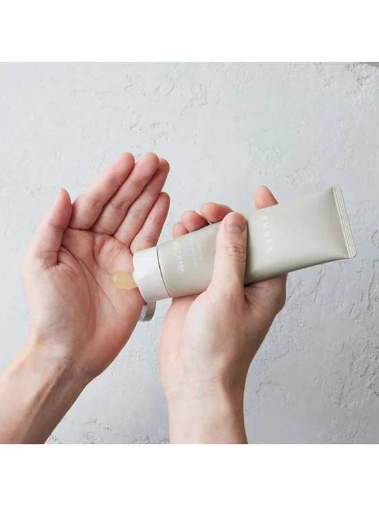 The jelly formula containing scrub tackles roughness and stiffness, leaving your skin refreshed right down to the base of the pores. The cool jelly feels pleasant to the touch, and simply spreading this non-lather facial wash over the skin and rinsing gives you skin that is free from visible pores. This gel wash, using THREE’s original agar-agar jelly formula, spreads smoothly across your skin, adhering closely to every contour and picking up all the dirt and sebum from your pores, missing nothing. The soft botanical scrub contained in the wash gently removes excess keratin, which causes roughness and prominent pores. It softens and loosens up your skin as it washes, leaving it fresh and highly translucent.