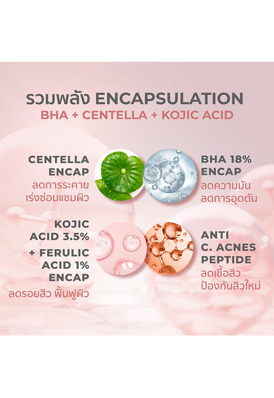 • BHA 18% Encapsulation: Controls oil production, prevents breakouts, and provides sustained release for up to 7 hours, without drying or irritating the skin.