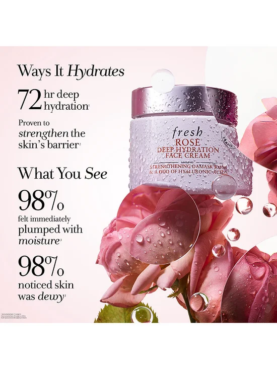 Rose Deep Hydration Face Cream by FRESH Our best-selling hyaluronic acid moisturizer that delivers 72-hour deep hydration with strengthening damask rose extract for skin that is dewy and plumped with moisture.