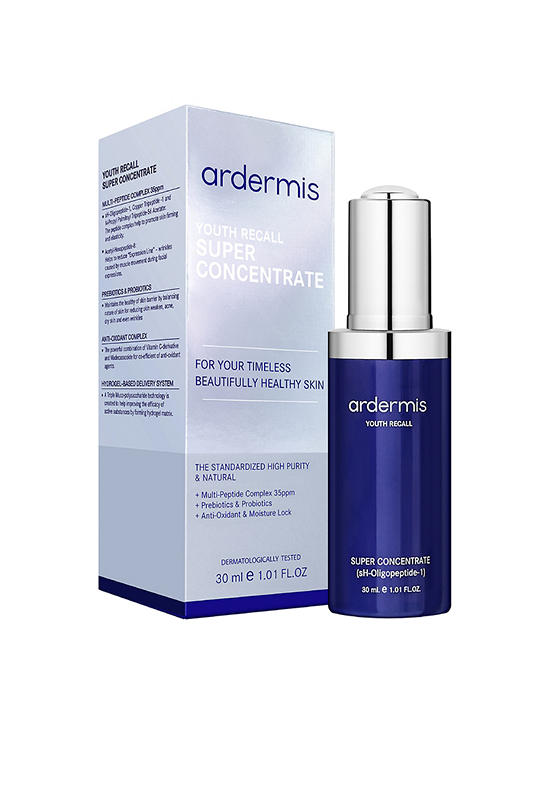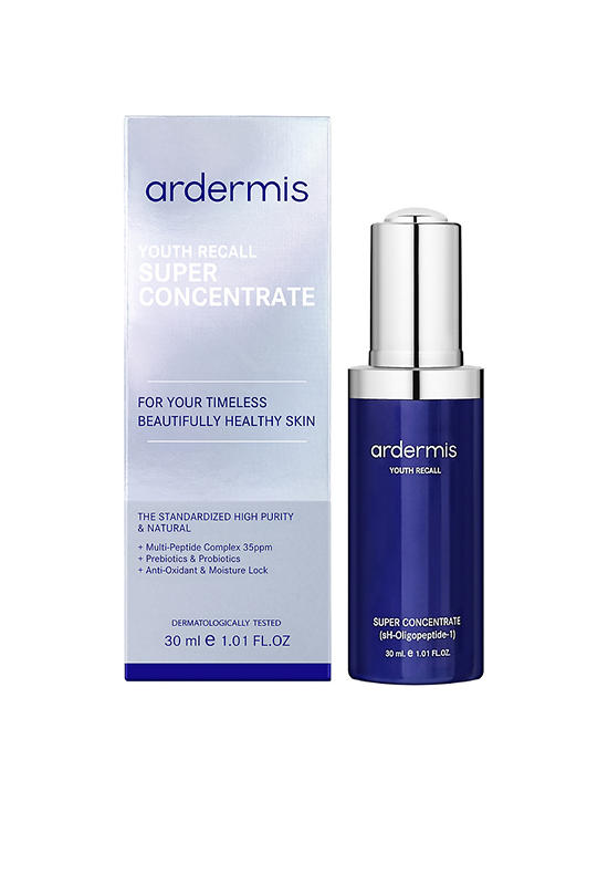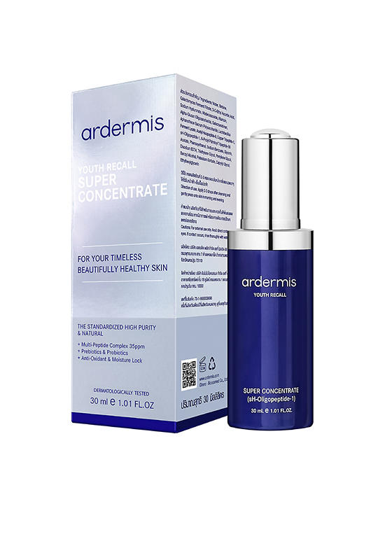 ผลิตภัณฑ์บำรุงผิว Ardermis ยูธ รีคอล ซูปเปอร์ คอนเซนเทรท ปรนิบัติผิวสู่ความอ่อนเยาว์ใน 28 วัน ด้วยนวัตกรรมทางวิทยาศาสตร์การแพทย์ สกัด BIOPEPTIDE (sH-Oligopeptide-1) มาเป็นส่วนผสมหลัก ส่งเสริมการทำงานของคอลลาเจน อิลาสติน และกรดไฮยาลูรอนิคให้มีประสิทธิภาพมากขึ้น เพื่อช่วยให้ริ้วรอยแห่งวัยแลดูลดเลือนลง ฟื้นฟูผิวเสื่อมสภาพจากภายใน เผยผิวสุขภาพดีอย่างเป็นธรรมชาติ พร้อมด้วยการเติมความชุ่มชื่น เสริมความยืดหยุ่นของผิว และ ปรับให้ผิวเรียบเนียน ใน 28 วัน
