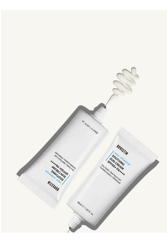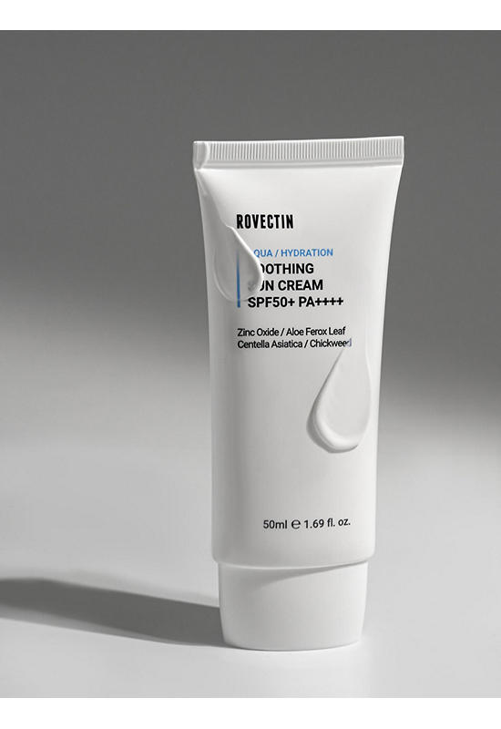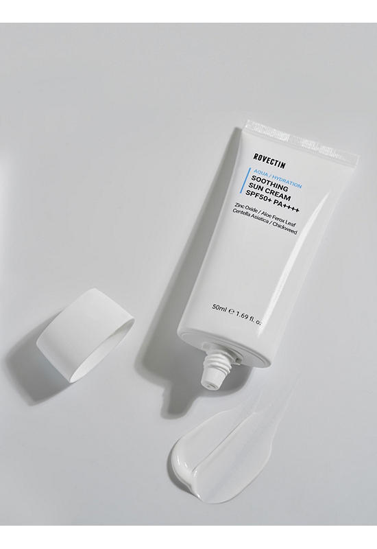 Rovectin Aqua Soothing Sun Cream SPF 50+, PA ++++ is a lightweight and moisturizing mineral UV sunscreen. Experience the benefits of a non-greasy formula that provides excellent sun protection without leaving any white cast or stickiness. This gentle and ultra-hydrating sunscreen is scientifically formulated with natural moisturizers to nourish and shield your skin from UVA, UVB, and blue lights.