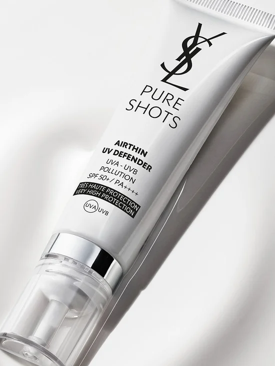 Anti UVA/ UVB, Pollution And Dust. SPF 50 PA ++++ from YVES SAINT LAURENT The formula contains a powerful complementary combination of UV filters within an airthin breathable texture. with the new Airthin UV Defender, a breakthrough 'airthin' technology 8x thinner than classic UV base, Free to breathe. Every day skin is actively protected from UVA, UVB, pollution and dust.