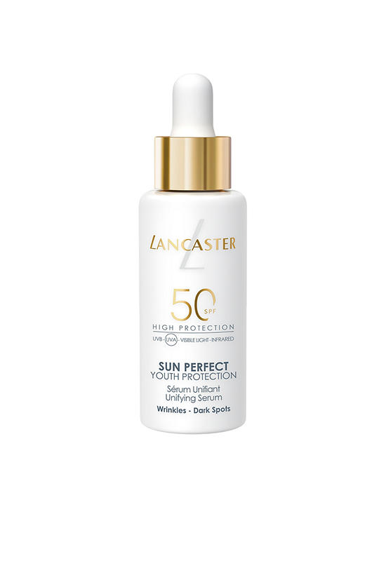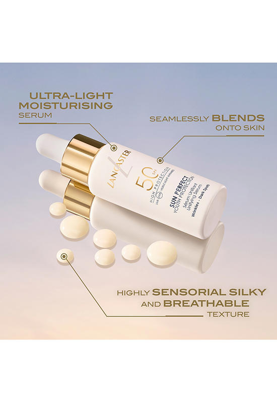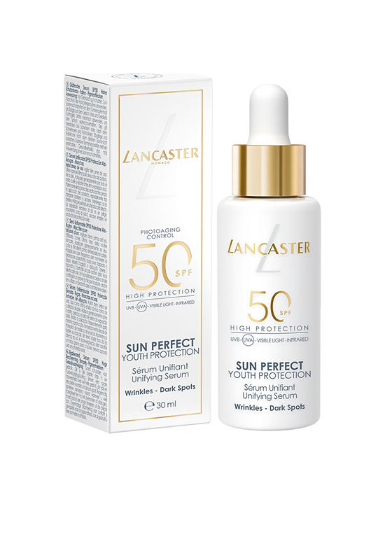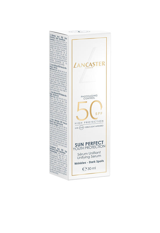 Reversing the visible signs of aging caused by photoaging, LANCASTER's new Sun Perfect Unifying Serum SPF50 is a potent concentrate featuring ultra-broad sun protection with anti-aging and repair efficacy. This daily photoaging shield promotes unified, perfected and younger-looking skin, by Lancaster, the N°1 Prestige Suncare Brand in Europe1. Sunlight exposure is responsible for 80% of visible signs of aging2, a process known as photoaging.