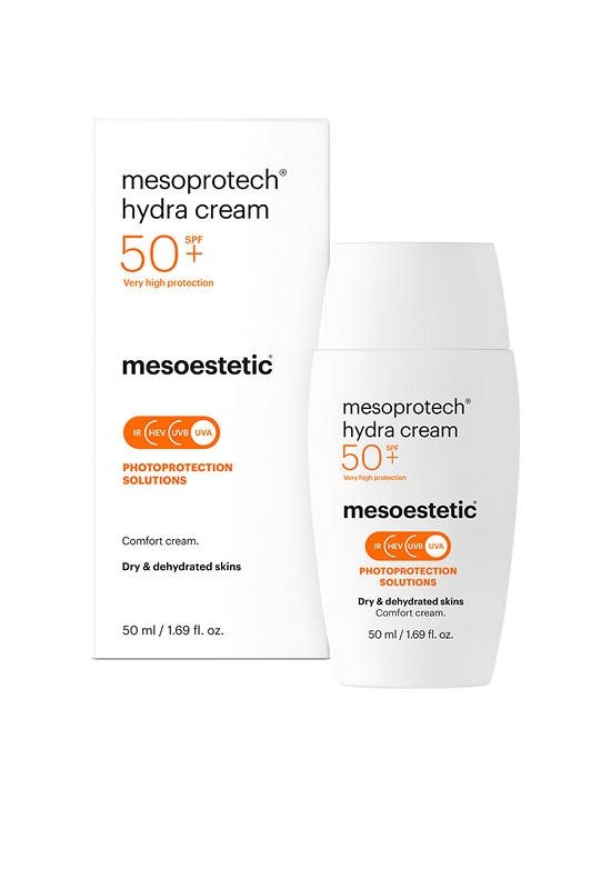 MESOESTETIC Facial sunscreen for dry and dehydrated skin with very high photoprotection, SPF50+, that provides comfort and hydration for greater skin elasticity and softness.