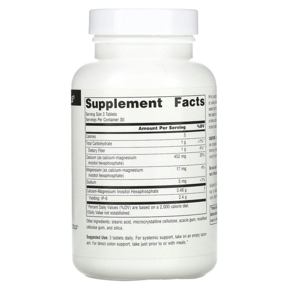 IP-6 (гексафосфат инозитола) является компонентом некоторых пищевых волокон, особенно большинства злаков, бобовых и семян с высоким содержанием масла. Многие исследователи считают, что некоторая польза клетчатки для здоровья может быть связана с антиоксидантным действием, укрепляющим иммунитет и поддерживающим сердечно-сосудистую систему IP-6. Исследования in vitro и на животных показали, что IP-6 оказывает существенное защитное и регулирующее рост действие на различные клетки и ткани, включая клетки толстой кишки, груди и простаты. Три таблетки Source Naturals IP-6 содержат 2400 мг IP-6, не содержащего других активных ингредиентов. Только IP-6 в таком виде стабильно демонстрирует положительные результаты исследований.