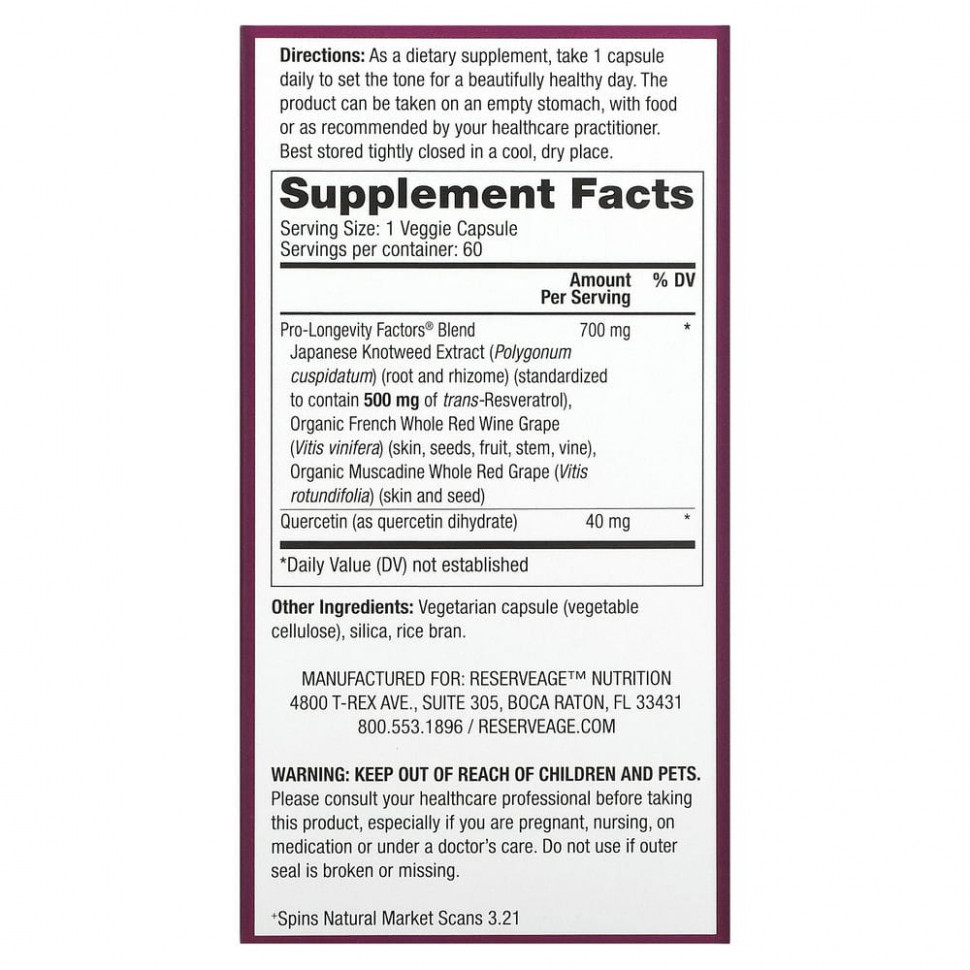 Компания Reserveage традиционно использует только экстракт дикорастущего горца японского наивысшего качества в сочетании с органическими ягодами французского красного винограда и органическим мускатным виноградом в составе продукта для долголетия Pro-Longevity Factors Blend.