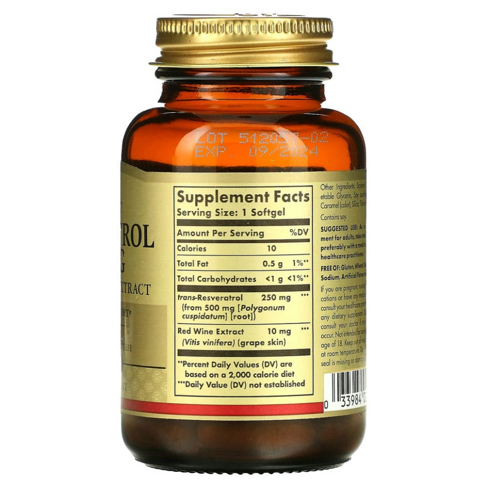 Solgar, Ресвератрол, 250 мг, 30 мягких желатиновых капсул
