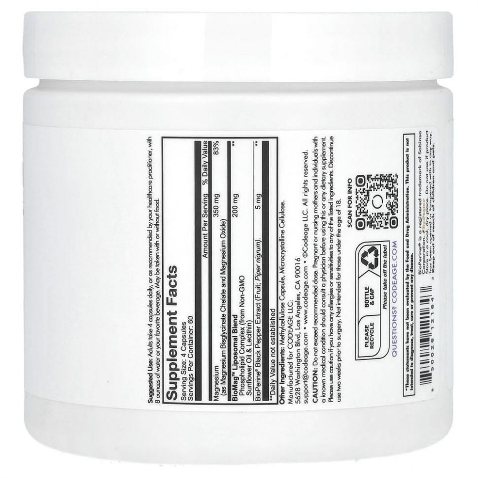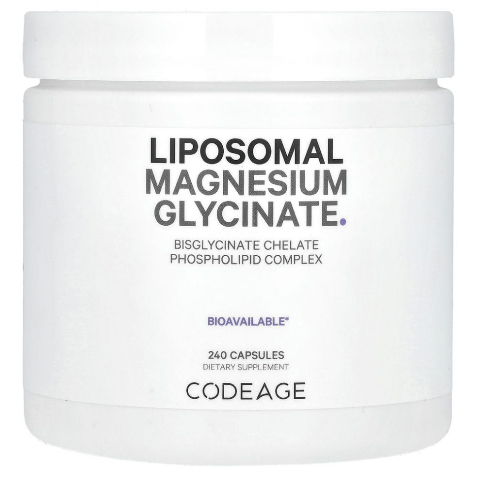 Успокаивающая формула липосомального глицината магния Codeage содержит 350 мг хелатного минерала магния на порцию, обогащенного комплексом фосфолипидов BioMag ™ и экстрактами плодов черного перца BioPerine® в капсулах.