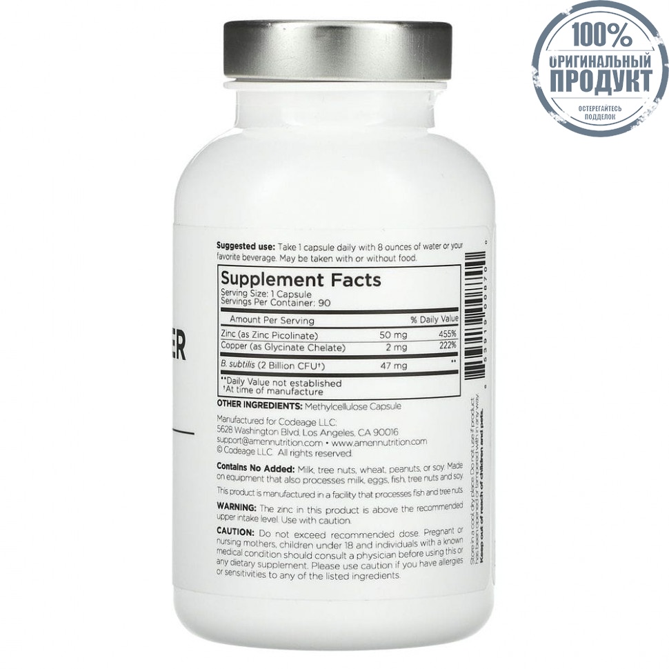 Добавка Amen с цинком и медью предлагает улучшенную смесь 50 мг биодоступного пиколината цинка и хелата глицината меди, которые помогают поддерживать иммунную функцию и общее самочувствие. Эта добавка с цинком также обогащена пробиотиками для поддержки здоровья кишечника. Эту добавку с пиколинатом цинка удобно принимать всего по 1 капсуле в день.