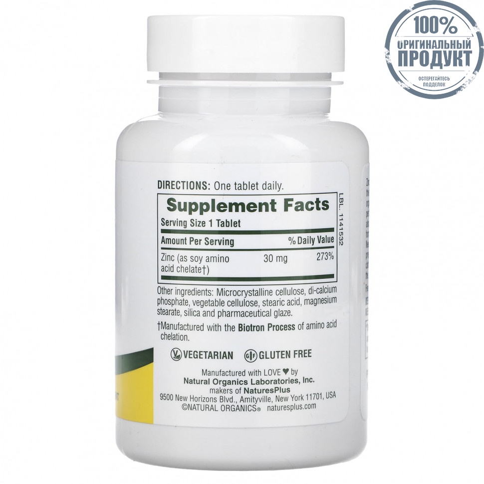 Пищевая ценностьРазмер порции: 1 таблетка Количество в 1 порции% от суточной нормыЦинк (в виде аминокислотного хелата из сои†)30 мг273%† Изготовлено с использованием процесса хелатирования аминокислот Biotron.