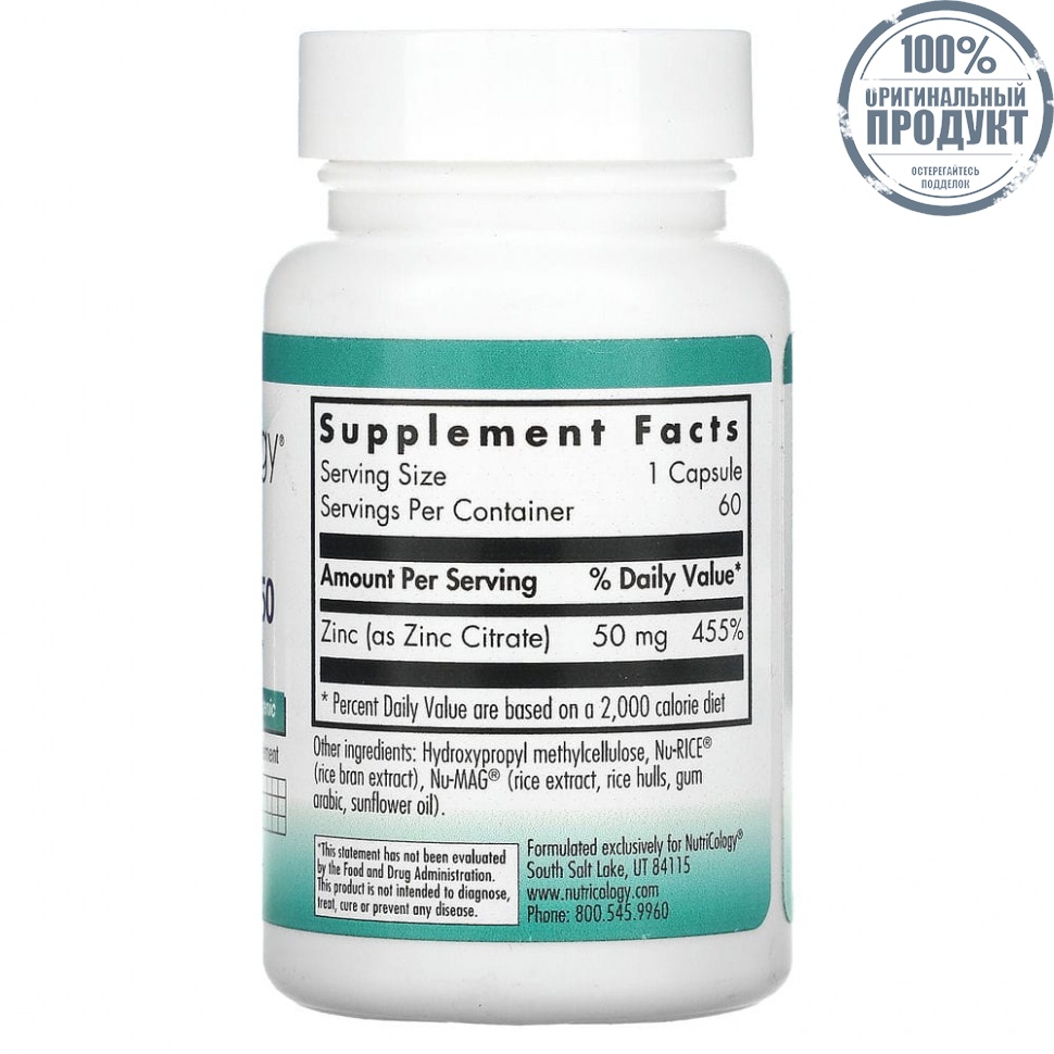 Nutricology, Цитрат цинка 50, 60 вегетарианских капсул