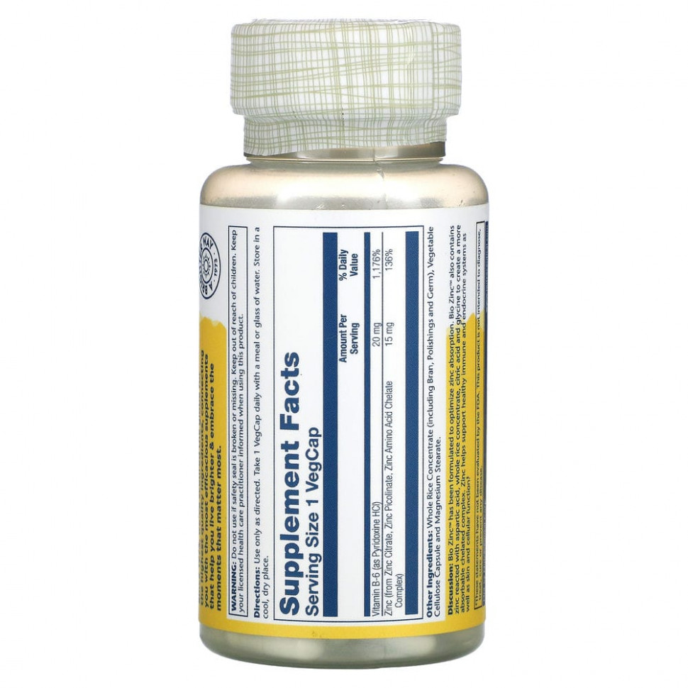 Solaray, Bio Zinc, 15 мг, 100 растительных капсул