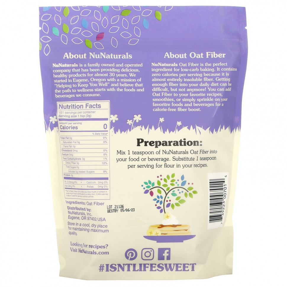 Овсяное волокно NuNaturals — это идеальный ингредиент для выпечки с низким содержанием углеводов. Порция овсяного волокна NuNaturals имеет нулевую калорийность, поскольку практически полностью состоит из нерастворимой клетчатки. Получать достаточное количество клетчатки в свой ежедневный рацион теперь не проблема. Овсяное волокно NuNaturals можно добавлять в рецепты любимых блюд и смузи, а также посыпать им еду и напитки.