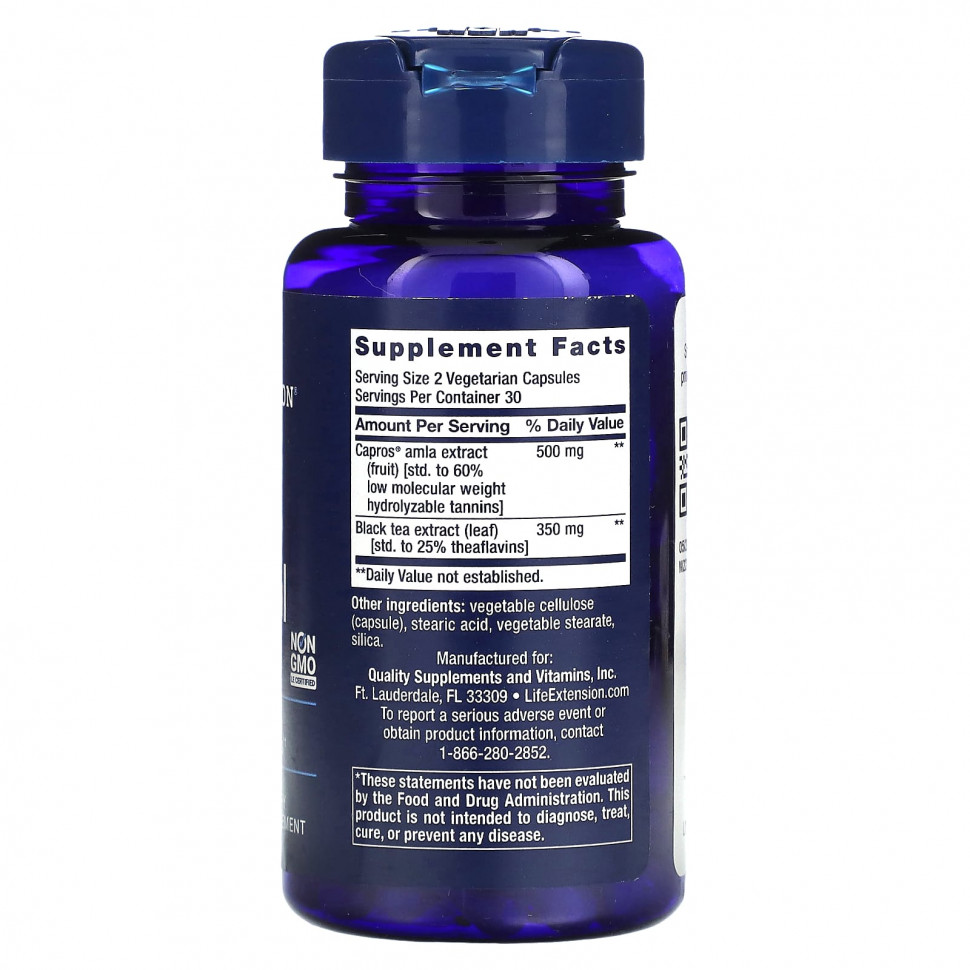Пищевая ценностьРазмер порции: 2 вегетарианские капсулыПорций в упаковке: 30 Количество в 1 порции% от суточной нормыЭкстракт плодов амлы Capros® [ст. до 60% низкомолекулярных гидролизуемых танинов]500 мг**Экстракт черного чая (лист) [ст. до 25% теафлавинов]350 мг**** Суточная норма не определена.