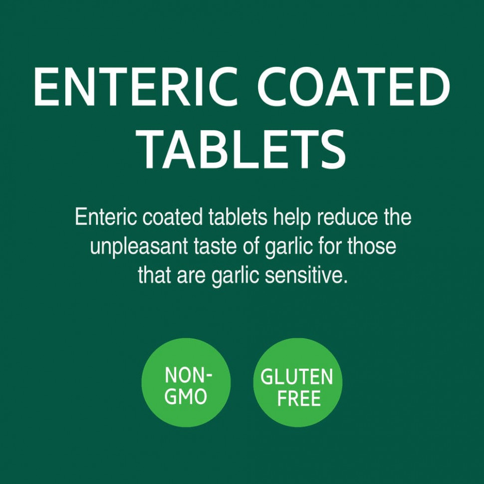 Экстракт чеснока содержит высокую концентрацию аллицина, который, как считается, отвечает за здоровье сердца и кровообращение. Таблетки, покрытые кишечнорастворимой оболочкой, помогают уменьшить неприятный вкус чеснока для людей, чувствительных к чесноку.
