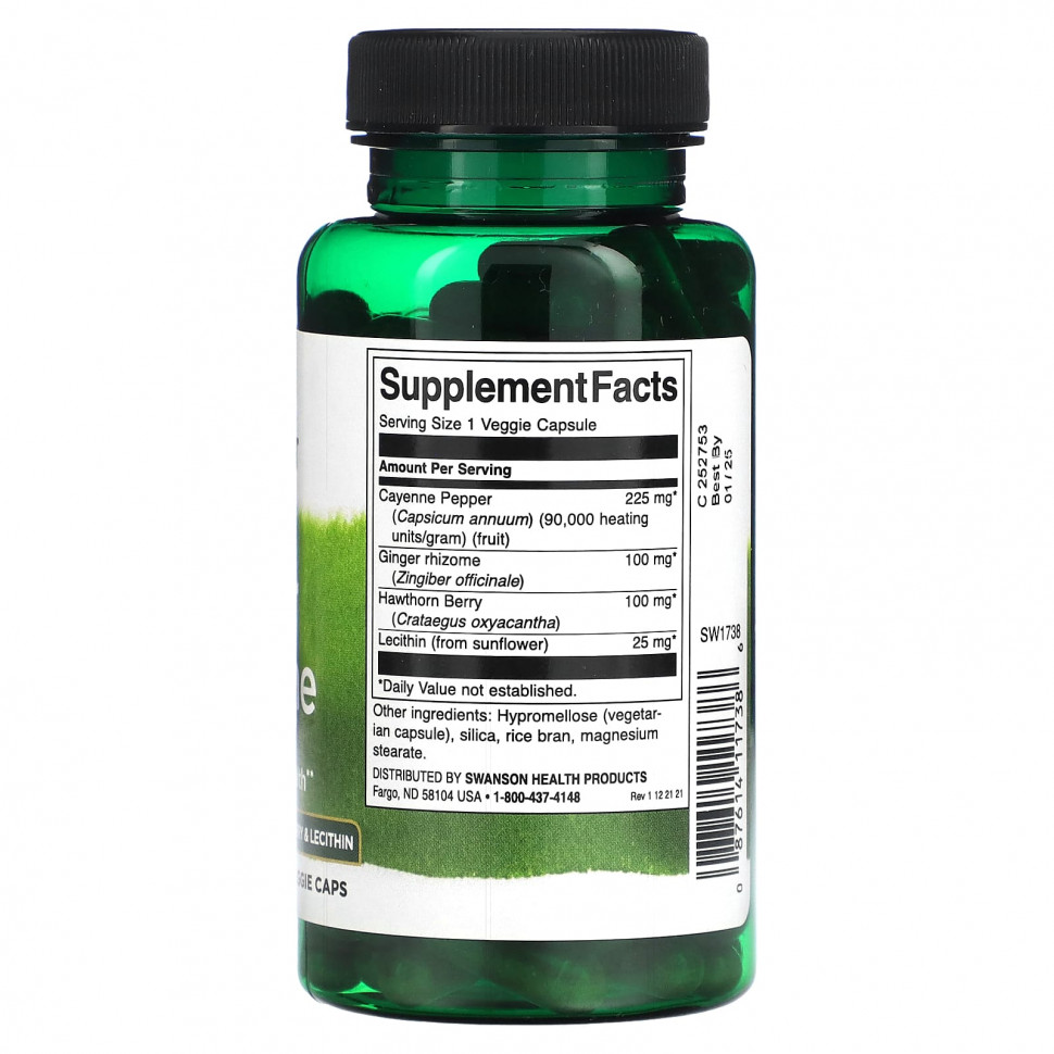 Кайенский перец - это не просто любимая специя в кулинарных блюдах. Добавка Swanson Super Cayenne помогает поддерживать здоровое кровообращение в организме, а также укрепляет здоровье сердечно-сосудистой системы. Эта специальная формула содержит 225 мг кайенского перца с корнем имбиря, ягодами боярышника и лецитином для мощной поддержки здоровья сердца.