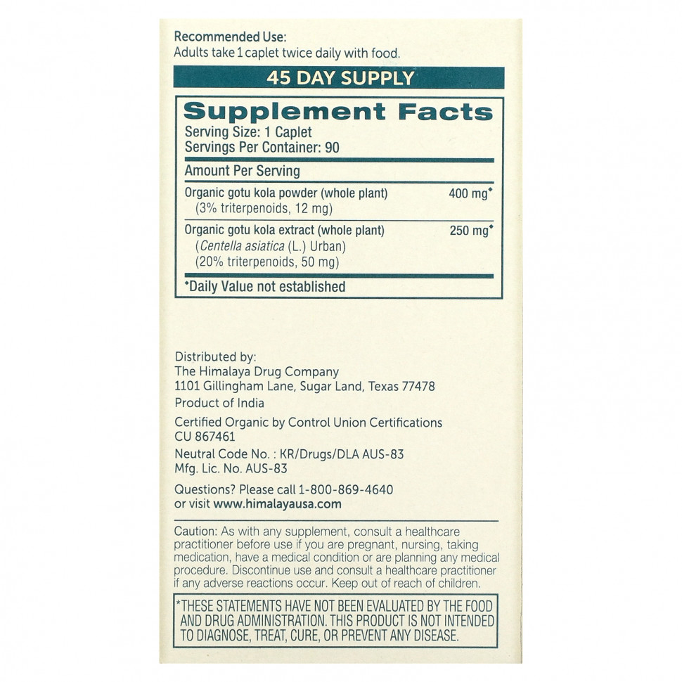 Каждая капсула Himalaya Organic Gotu Kola эквивалентна 3900 мг порошка органического Gotu Kola на порцию.
