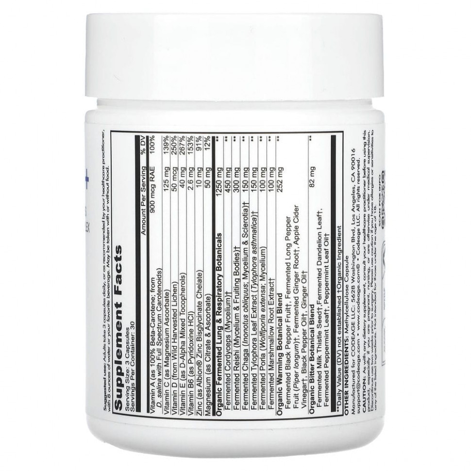 CodeAge Lungs предлагает цельные пищевые витамины A, B6, C, D3, E, а также расторопшу с цинком и магнием. Он также содержит кордицепс, рейши, имбирь, листья перечной мяты. & органические травы в универсальном растворе капсул.