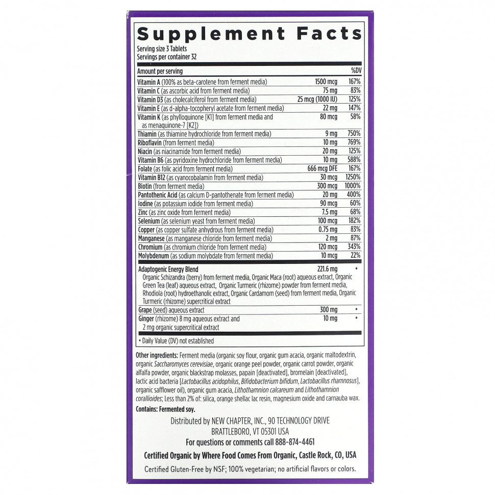 Пищевая ценностьРазмер порции: 3 таблеткиПорций в упаковке: 32 Количество в 1 порции% от суточной нормыВитамин A (100% в виде бета-каротина из ферментированной среды)1500 мкг167%Витамин С (в виде аскорбиновой кислоты из ферментированной среды)75 мг83%Витамин D3 (в виде холекальциферола из ферментированной среды)25 мкг (1000 МЕ)125%Витамин E (в виде d-альфа-токоферилацетата из ферментированной среды)22 мг147%Витамин К (в виде филлохинона [K] из ферментированной среды и в виде менахинона-7 [K2])80 мкг58%Тиамин (в виде тиамина гидрохлорида из ферментированной среды)9 мг750%Рибофлавин (из ферментированной среды)10 мг769%Ниацин (в виде никотинамида из ферментированной среды)20 мг125%Витамин В6 (в виде пиридоксина гидрохлорида из ферментированной среды)10 мг588%Фолат (в виде фолиевой кислоты из ферментированной среды)666 мкг пищевого фолатного эквивалента167%Витамин В12 (в виде цианокобаламина из ферментированной среды)30 мкг1250%Биотин (из ферментированной среды)300 мкг1000%Пантотеновая кислота (в виде D-пантотената кальция из ферментированной среды)20 мг400%йодин (в виде йодида калия из ферментированной среды)90 мкг60%Цинк (в виде оксида цинка из ферментированной среды)7,5 мг68%Селен (в виде селеновых дрожжей из ферментированной среды)100 мкг182%Медь (в виде безводного сульфата меди из ферментированной среды)0,75 мг83%Марганец (в виде хлорида марганца из ферментированной среды)2 мг87%Хром (в виде хлорида хрома из ферментированной среды)120 мкг343%Молибден (в виде молибдата натрия из ферментированной среды)10 мкг22%Адаптогенная энергетическая смесь