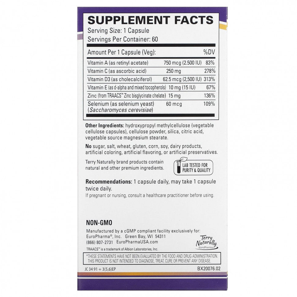 Пищевая ценностьРазмер порции: 1 капсулаПорций в упаковке: 60 Количество в 1 порции% от суточной нормы Витамин A (в виде ретинилацетата)750 мкг (2500 МЕ)83%Витамин С (в виде аскорбиновой кислоты)250 мг278%Витамин D3 (в виде холекальциферола)62,5 мкг (2500 МЕ)313%Витамин E (в виде d-альфа и смешанных токоферолов)10 мг (15 МЕ)67%Цинк (из хелата бисглицината цинка TRAACS ™)15 мг136%Селен (в виде селеновых дрожжей) (Saccharomyces cerevisiae)60 мкг109%