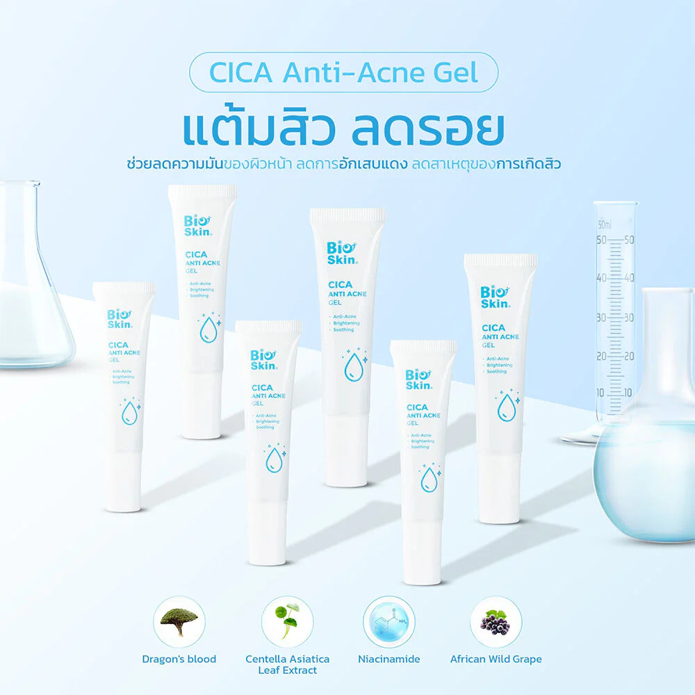 Bioskin Cica Anti Acne Gel 15g An acne spot treatment gel that combines the active properties of four extracts: a special drug-release technology that is rich in African Wild Grape, combined with Bentonite, Centella Asiatica Extract, Vitamin B3 and Dragon's Blood, to gently exfoliate the skin, reduce acne inflammation directly, and soothe acne-prone skin. Apply as often as needed.
