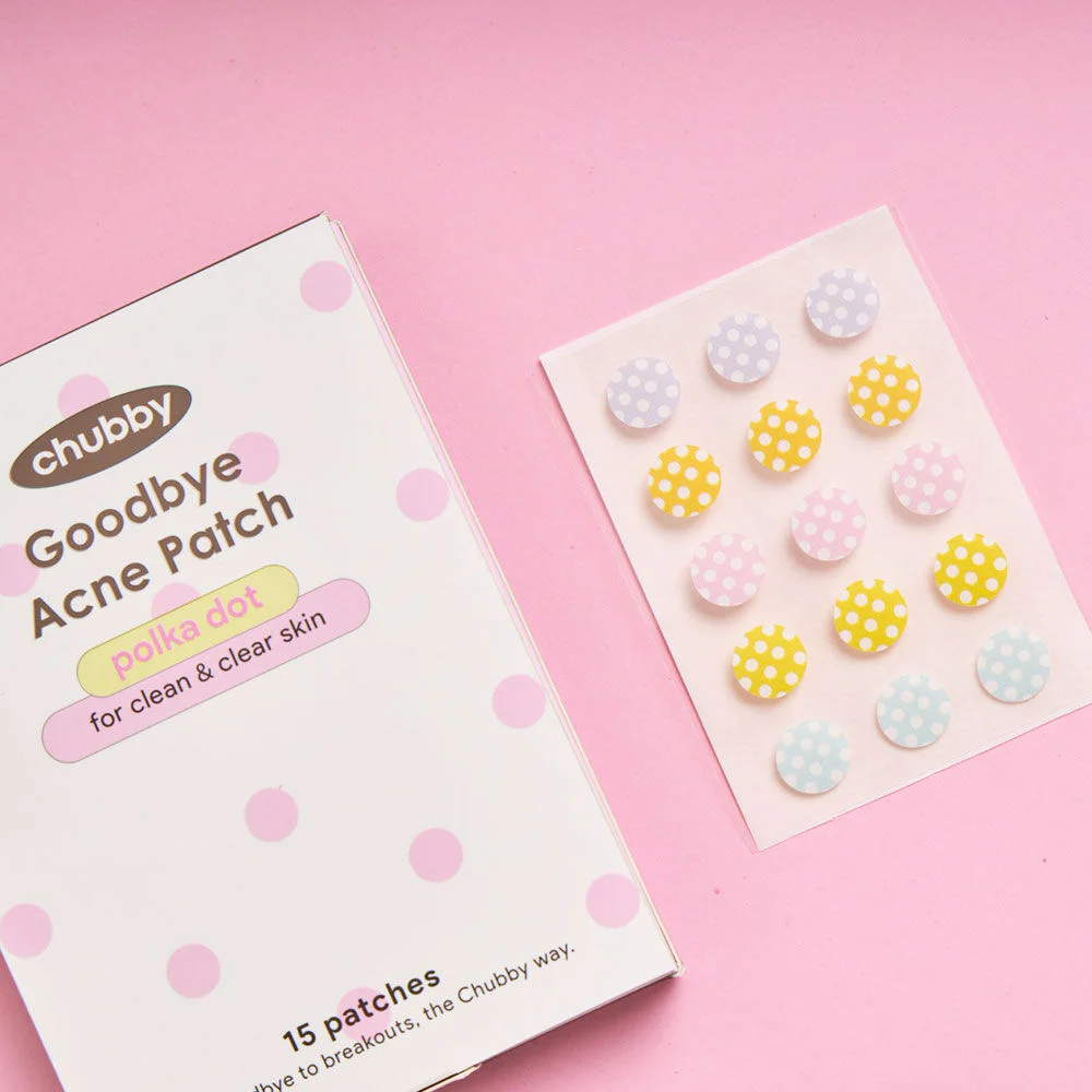 Chubby Goodbye Acne Patch 15 Dots #Polka Dot Hydrocolloid acne absorbing patch with Polka Dot pattern helps reduce acne inflammation, prevent bacteria, and absorb acne fluid very well, making acne heal faster.