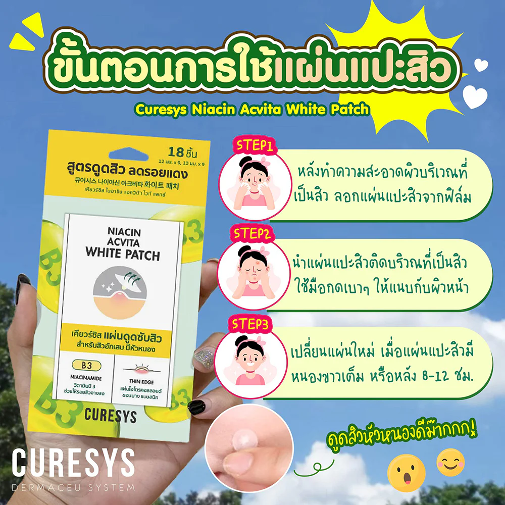 CURESYS Niacin Acvita White Patch 18 DotsHydrocolloid acne absorbing sheetExcellent acne absorptionWith innovation Thin edge Thin edge ironingslickAttached to the skinSuperior with extracts Niacinamide (Vitamin B3) Helps reduce redness from acne.Stick firmlyWaterproofGood coverageCan be applied over makeup