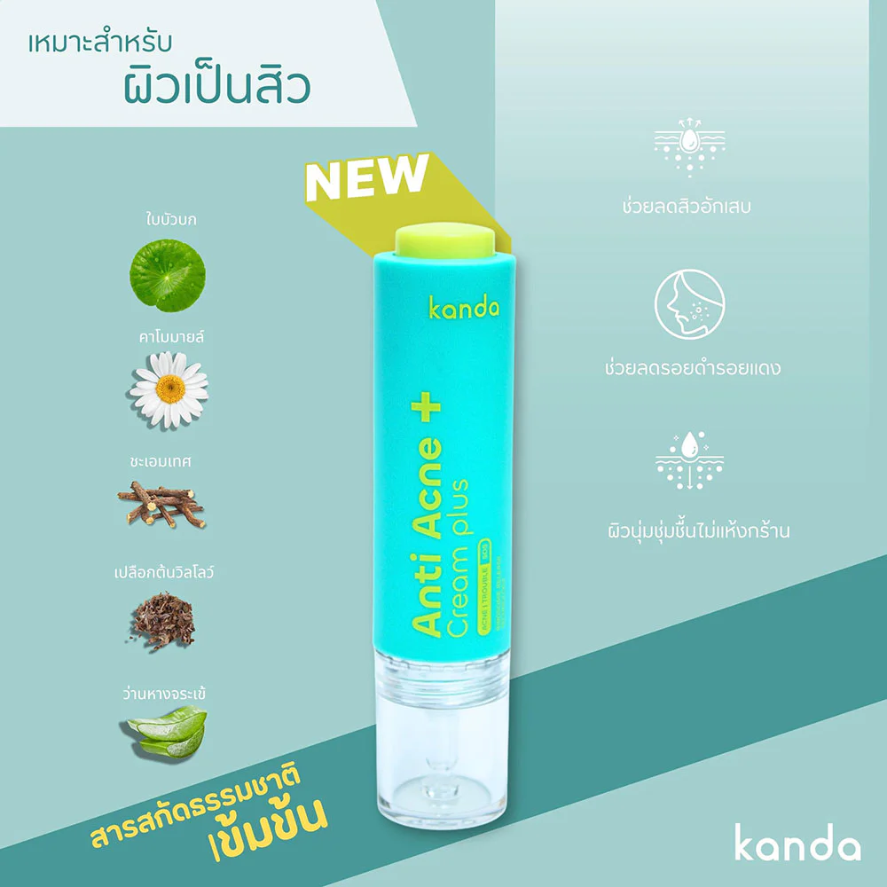Kanda Anti Acne Cream Plus 15g A gel-cream acne treatment that combines the benefits in one. It helps treat acne inflammation, reduces redness and dark spots caused by acne, making them appear lighter. It is rich in a variety of natural extracts such as chamomile, Centella asiatica, vitamin B3, zinc, and BHA from willow bark. It also helps nourish acne-affected areas to be soft and moist, not dry.