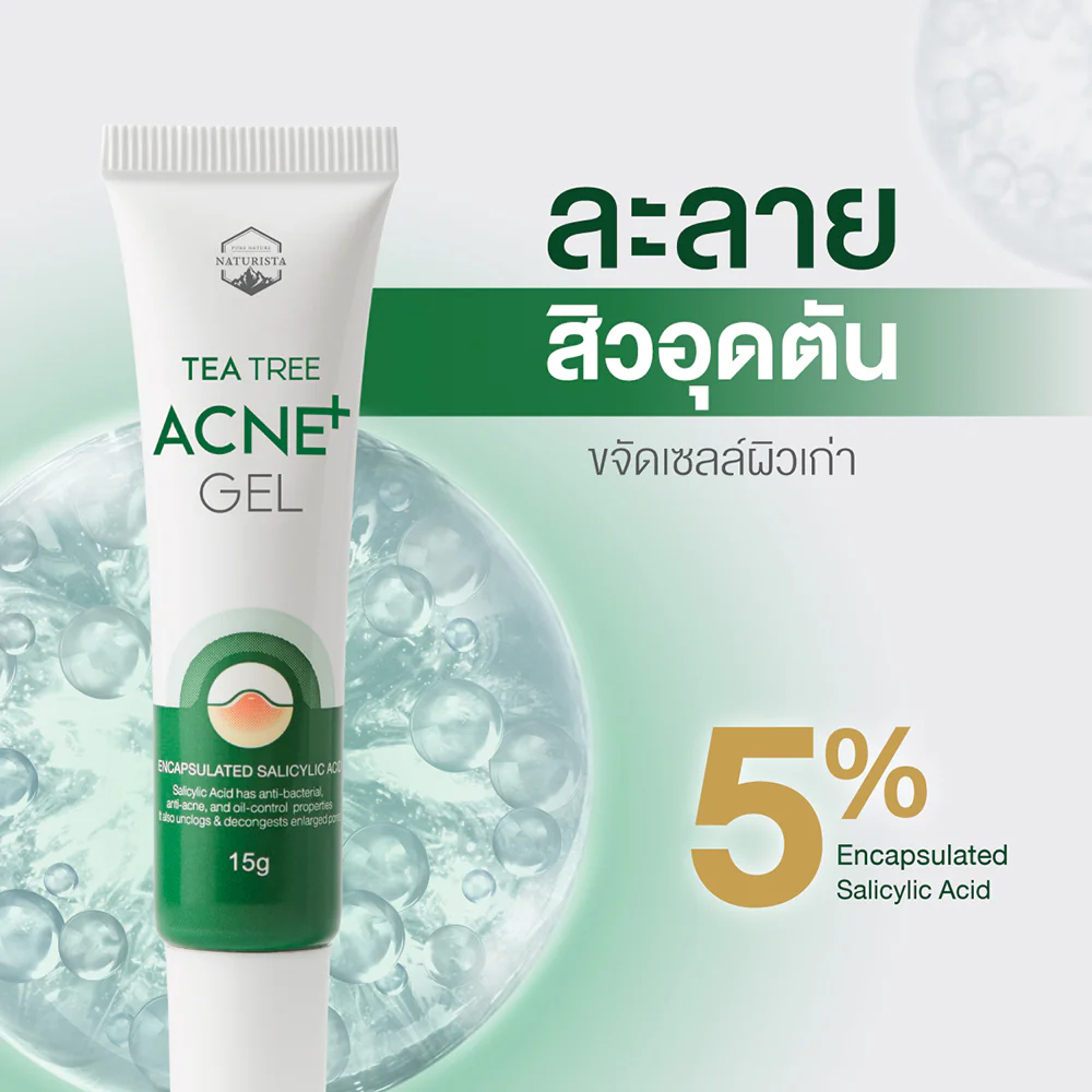 Naturista Tea Tree Acne Gel 15g Acne gel, rich in concentrated tea tree extract combined with Encapsulated Salicylic Acid 5%, which works equivalent to Salicylic Acid 2%, able to dissolve clogged pores. and removes things that clog pores It also has the ability to effectively reduce inflammation, reduce dark spots and redness caused by acne.