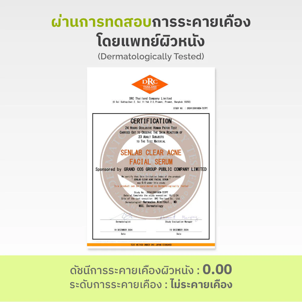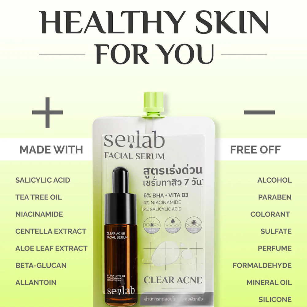 Senlab Clear Acne Facial Serum Sachet 7g Facial serum with a light texture, not sticky. Innovation for the new generation Hybrid Active combines 6% BHA Sphere, 4% Purify Niacinamide and 2% Encapsulated Salicylic Acid to help take care of acne problems, reduce dark spots from acne and control oiliness along with Centella Asiatica extract, 100% Tea Tree Essential Oil and helps soothe the skin to be moisturized, revealing smooth, healthy skin.