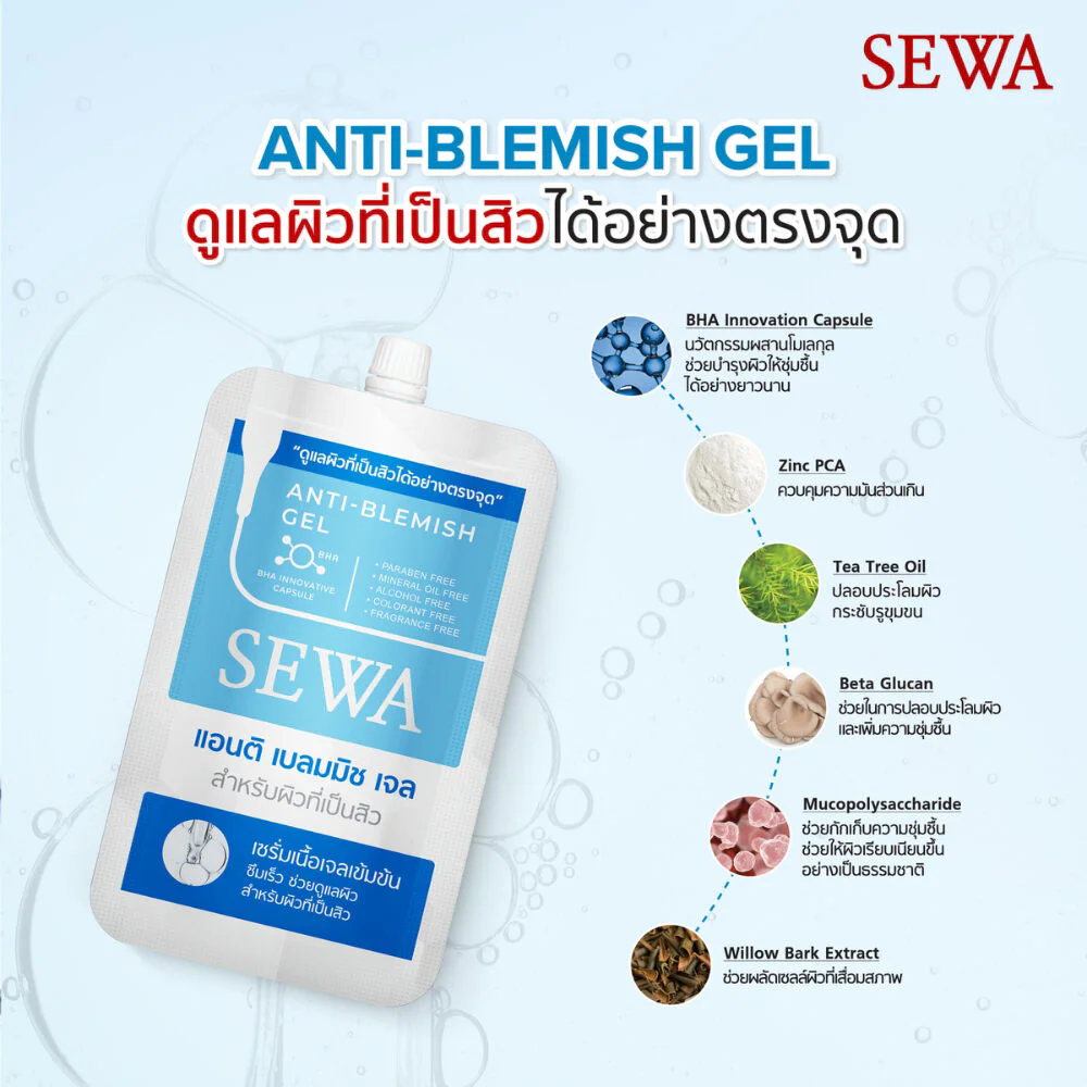 Sewa Anti-Blemish Gel 4g This concentrated gel serum absorbs quickly and helps care for acne-prone skin with the innovative BHA Innovation Capsule, which combines Mucopolysaccharide, Zinc PCA, and Beta Glucan to control oil on the face, a cause of acne. It moisturizes and soothes the skin, while also improving the appearance of smooth skin.