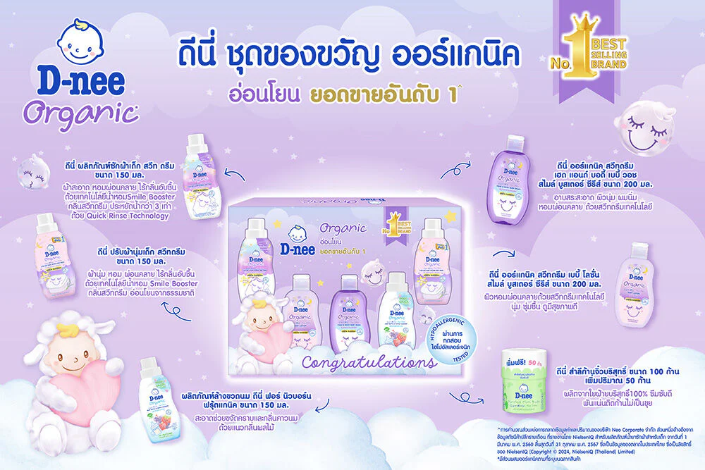 D-nee Baby Fabric Softener Organic Sweet Dream 150ml D-nee Organic Baby Fabric Softener Sweet Dream with Smile Booster Technology, a relaxing fragrance technology that helps your baby sleep easily, and helps reduce musty odors. The scent is gentle and not pungent, suitable for babies or those with sensitive skin.