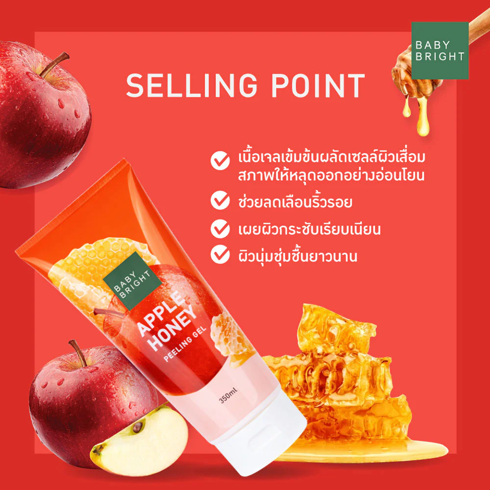Baby Bright Apple Honey Peeling Gel 350ml Scurf peeling gel, concentrated gel texture that gently exfoliates dead skin cells. without causing skin irritation with apple extract Containing flavonoids (Flavonoid) as anti-oxidants as well as being rich in various vitamins Helps strengthen elastin and collagen that are beneficial to the skin. Combining honey extracts An important helper in retaining moisture for the skin as well, making the skin firm, smooth, not dry, tight, soft, moisturized for a long time. Adjust the skin to look healthy. ready for the next step of maintenance
