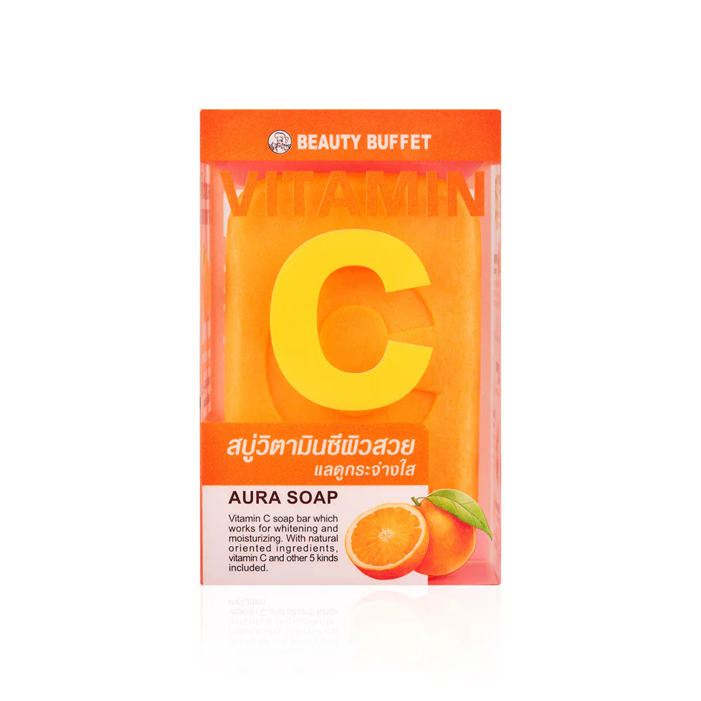 Beauty Buffet Vitamin C Aura Soap 100g body cleaning products Skin nourishing soap from orange and papaya. rich in vitamin C Helps skin look radiant and clear. Ready to fill the value of nature. Thanaka helps reduce dark spots. and aloe Does not dry out the skin and help nourish the skin to be soft and moist