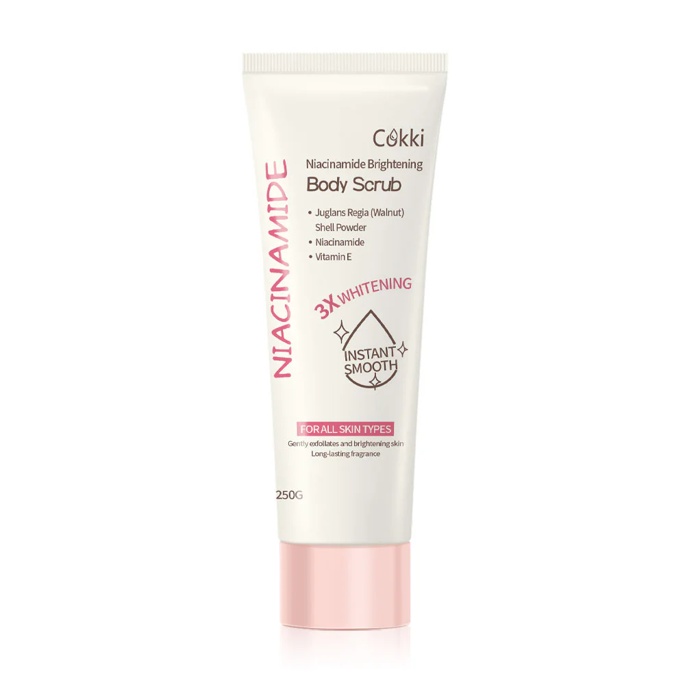 cokki Niacinamide Brightening Body Scrub 250ml Exfoliate your skin to reveal a glowing complexion with this body scrub. Enriched with natural scrub beads from crushed walnut shells, it helps remove dead skin cells. Combined with Vitamin E and Niacinamide, it brightens the skin, leaving it feeling soft and looking smoother.